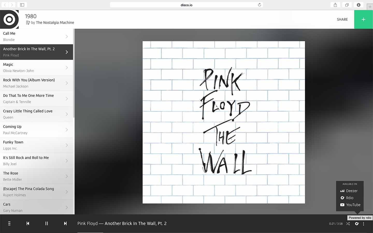 By matching free and subscription music services, DISCO.IO always finds the best available source.
